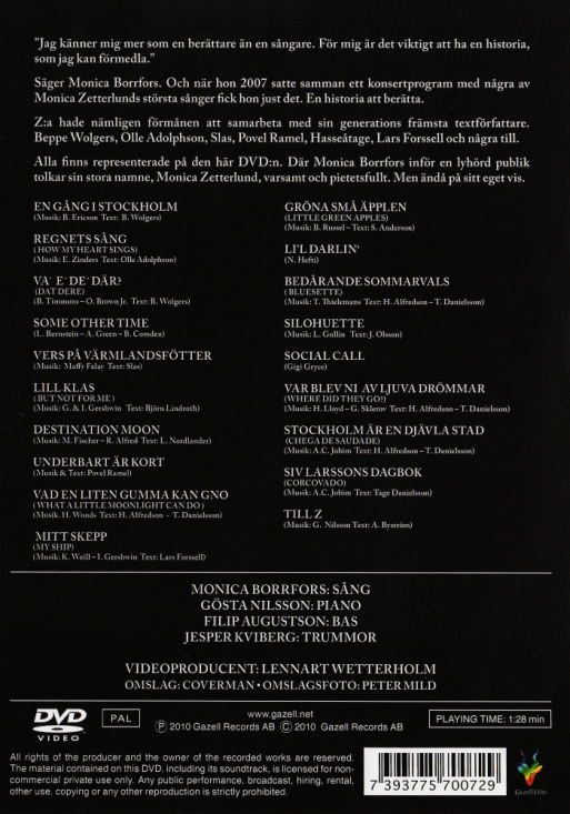 "I feel more like a storyteller than a singer. To me, it is important to have a story to convey", says Monica Borrfors. When she put together a concert program with some of Monica Zetterlund's biggest songs in 2007, she got just that. A story to tell.