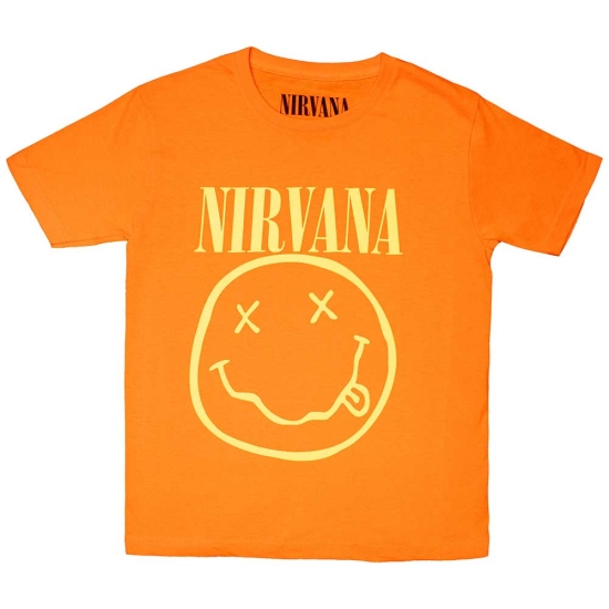 Nirvana - Happy Face Boys T-Shirt Orange in the group MERCHANDISE / Merch / Pop-Rock at Bengans Skivbutik AB (5548769r)